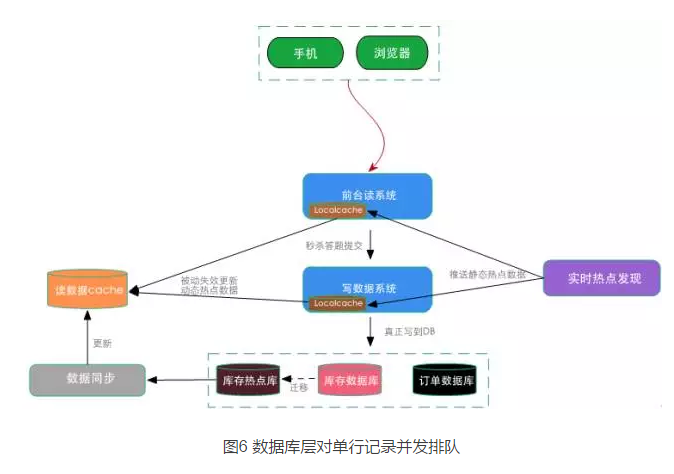 数据库层做排队。应用层只能做到单机排队,但应用机器数本身很多,这种排队方式控制并发仍然有限,所以如果能在数据库层做全局排队是最理想的,淘宝的数据库团队开发了针对这种MySQL的InnoDB层上的patch,可以做到数据库层上对单行记录做到并发排队,如图6所示。