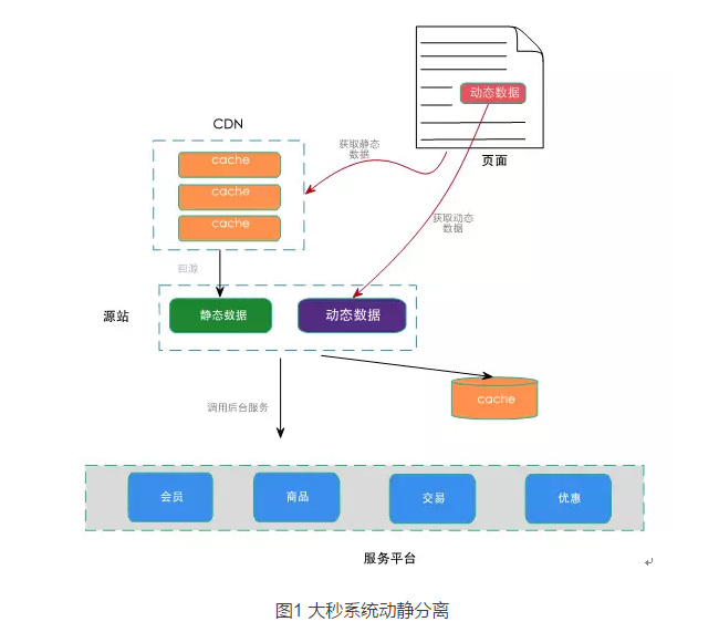 前面介绍在系统层面上的原则是要做隔离,接下去就是要把热点数据进行动静分离,这也是解决大流量系统的一个重要原则。如何给系统做动静分离的静态化改造我以前写过一篇《高访问量系统的静态化架构设计》详细介绍了淘宝商品系统的静态化设计思路,感兴趣的可以在《程序员》杂志上找一下。我们的大秒系统是从商品详情系统发展而来,所以本身已经实现了动静分离,如图1。