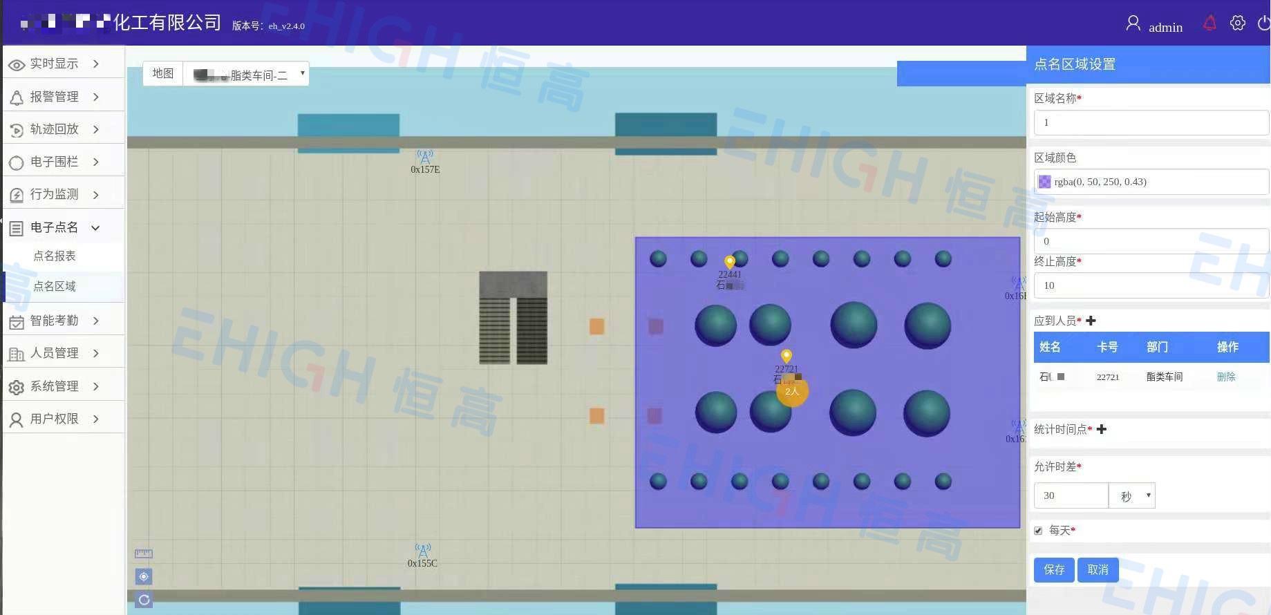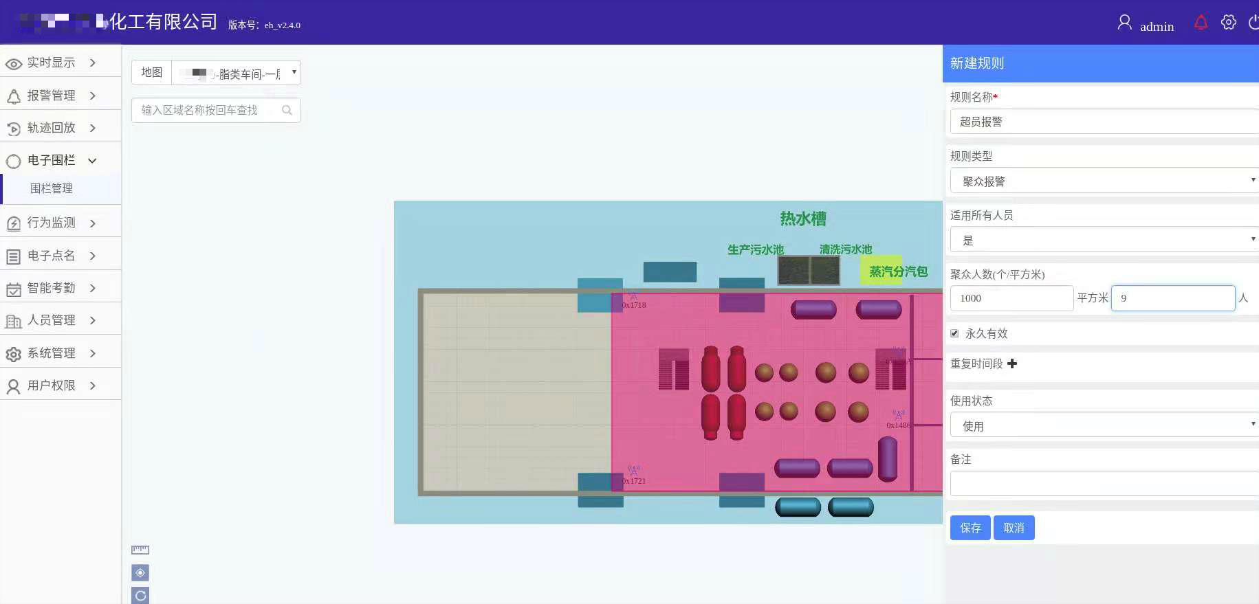 通过在化工厂人员定位系统管理后台设置每个生产车间或区域的限制人数,可实现超员报警和缺员报警功能。如果该区域授权的总人数已经满员或未达标,系统发出预警信息,提醒管理人员及时予以干预。