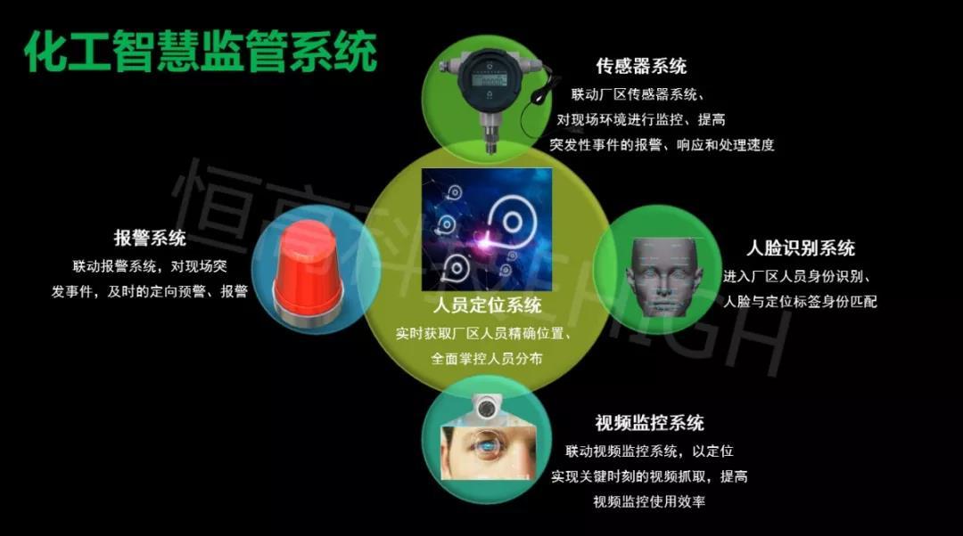 “工欲善其事必先利其器!”为了解决化工安全保障难问题,恒高科技 “化工厂整体解决方案”以安全管理和信息智慧化为基本出发点,提出了化工智慧监管系统平台。平台由5大核心应用系统组成,分别是:人员定位系统、传感器系统、视频监控系统、报警系统、人脸识别系统。