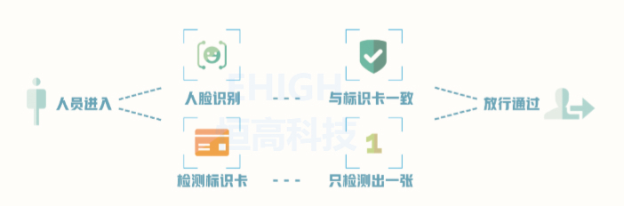 厂内员工进门时分别通过人脸识别与标签卡识别,如果身份与标识卡不一致,则系统判别为人卡不一致,并相应触发人卡不一致报警,实现进出人员实名制考勤,防止员工携带他人标签卡的情况发生,实现员工人卡一致性、实名制检测。