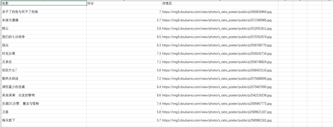 # 创建csv文件进行写入csv_file = open('scr.csv', 'a', encoding='gbk')csv_writer = csv.writer(csv_file)# 写入csv标题头内容csv_writerr.writerow(['电影', '评分', "详情页"])#写入数据csv_writer.writerow([id, rate, urll])