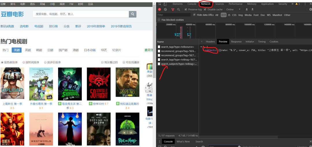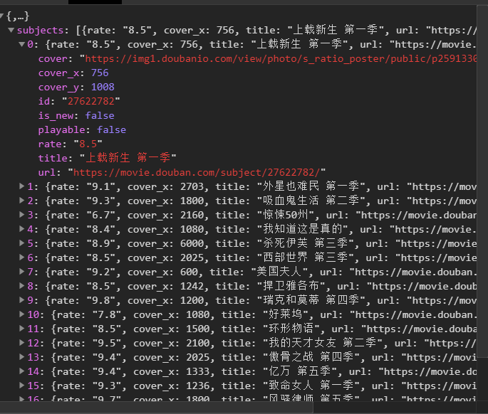 2)点开subjects,可以看到 title 就是对应电影名称。rate就是对应评分。通过js解析subjects字典,找到需要的字段。