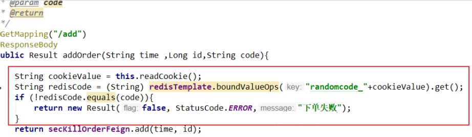 String randomcode = (String) redisTemplate.boundValueOps("randomcode").get(); if (StringUtils.isEmpty(randomcode) || !random.equals(randomcode)){