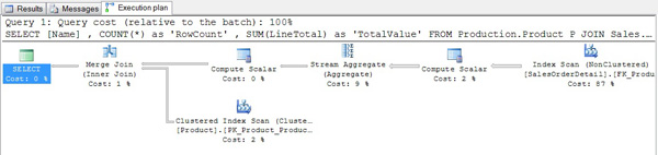 然而,你关心于这个查询的潜在消耗,SalesOrderDetail 是这个查询所涉及的表中较大的那个,并且它的数据行必须按照产品名称分组,而这个产品名存在于Product 表,并不在SalesOrderDetail 表中。通过SSMS,你注意到SalesOrderDetail 表在它的主键上是聚集的(SalesOrderID / SalesOrderDetailID),当试着按产品名称分组时候这并不会产生任何益处。