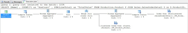 SQL SERVER 能够同时扫描SalesOrderDetail 表上的覆盖索引和Product 表的聚集索引,它们两者都是以ProductID的顺序排列的,产生每个分组的总数,然后以产品名称合并,并不需要做任何排序或者哈希,简而言之,SQL SERVER为你的查询产生尽可能高效的执行计划。