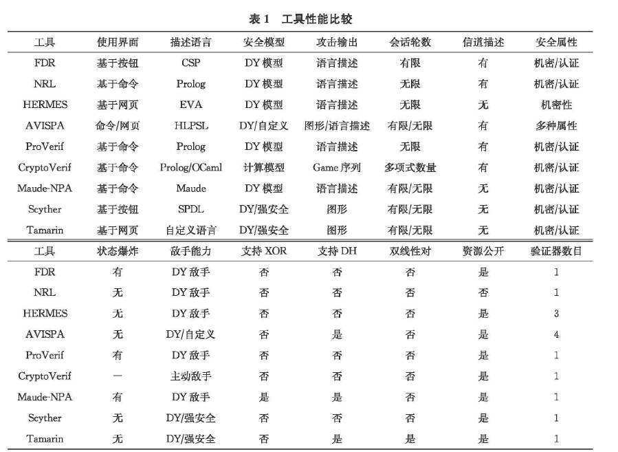 下图是比较 形式化分析的工具性能的截图(基本上可以对自己要分析的协议有一个基本的判断之后,就可以选择使用什么样的工具来分析协议)