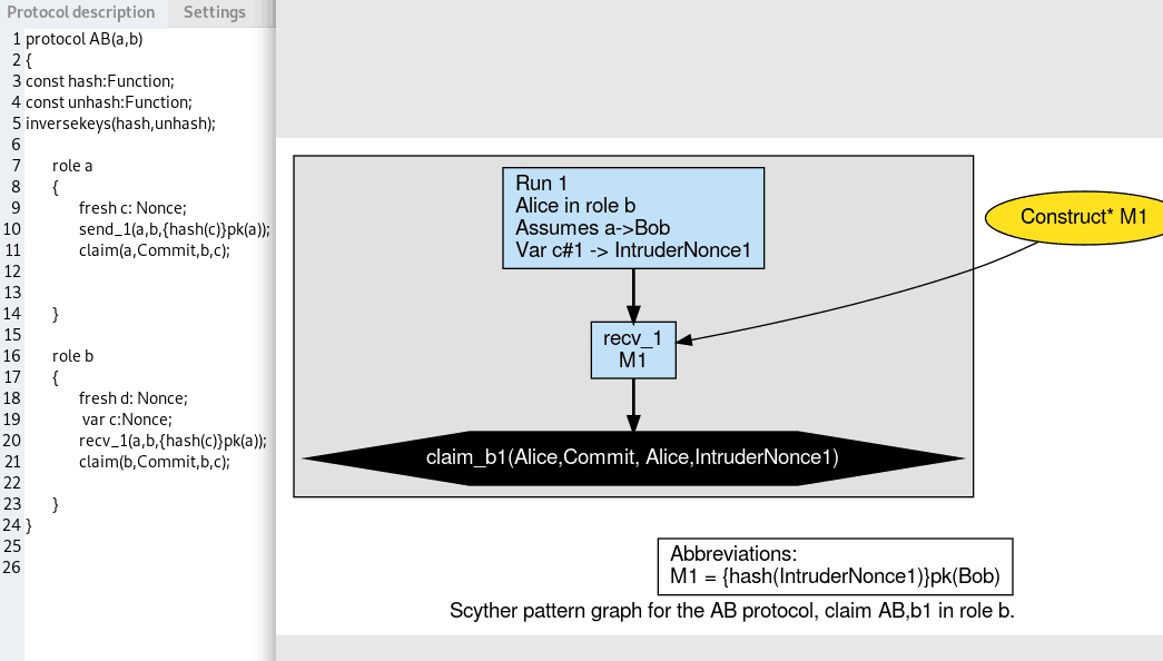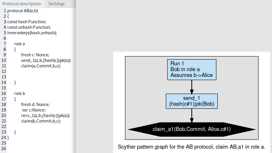 为了简单 我们只让 a 发送一个 使用 hash() 加密的 消息 c 给 b ,并且我们在安全属性声明 b可以获得 消息 c 承认接受到 。