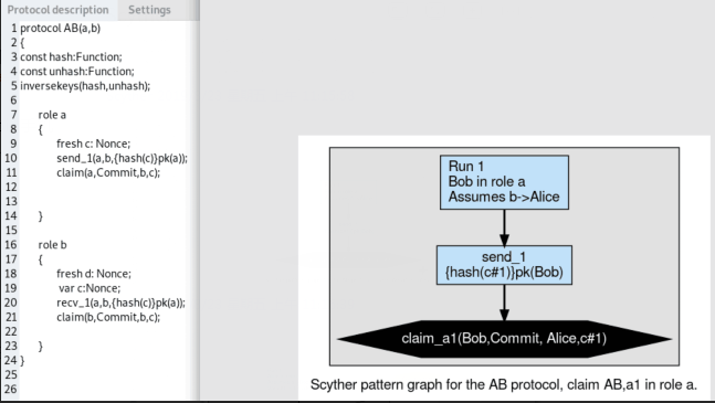 先分析上面举的例子: 图片放小一点来看 , 首先 我们在协议中声明了两个角色(分别表示客户端A--a和 服务端B---b),声明了常量 函数 hash 和 unhash 并且标明了 互为反函数