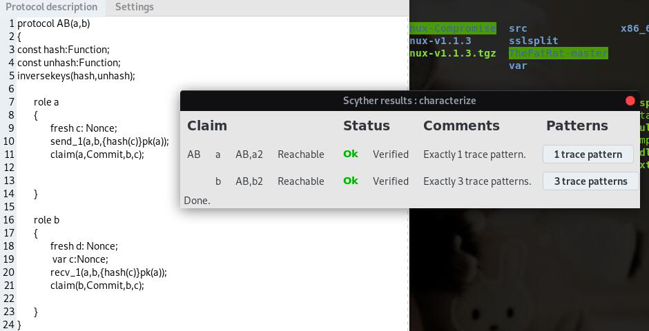 scyther 使用 该算法对协议进行分析,如果在输入协议,划分成多个主题规格,调用该算法,如果能不能搭建出安全声明的反例,则输出OK 反之输出Fail