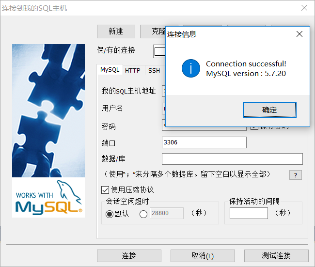 因为上一篇文章我就已经给MySQL新建了一新用户,且赋予了远程连接数据库的所有权限(GRANT ALL PRIVILEGES ON *.* TO 'newuser' @ '%' IDENTIFIED BY 'newpass' WITH GRANT OPTION;)