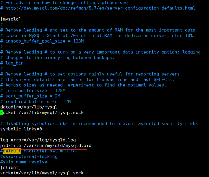 但当我vim /etc/my.cnf打开配置文件时里面十分干净,没有其他多余设置,后面几条是我后来添加的。