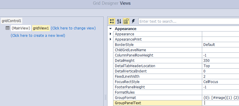 gridView1.GroupFormat = "{1} {2}"; //默认"{0}: [#image]{1} {2}"; 字段名称:数据 计数=?
