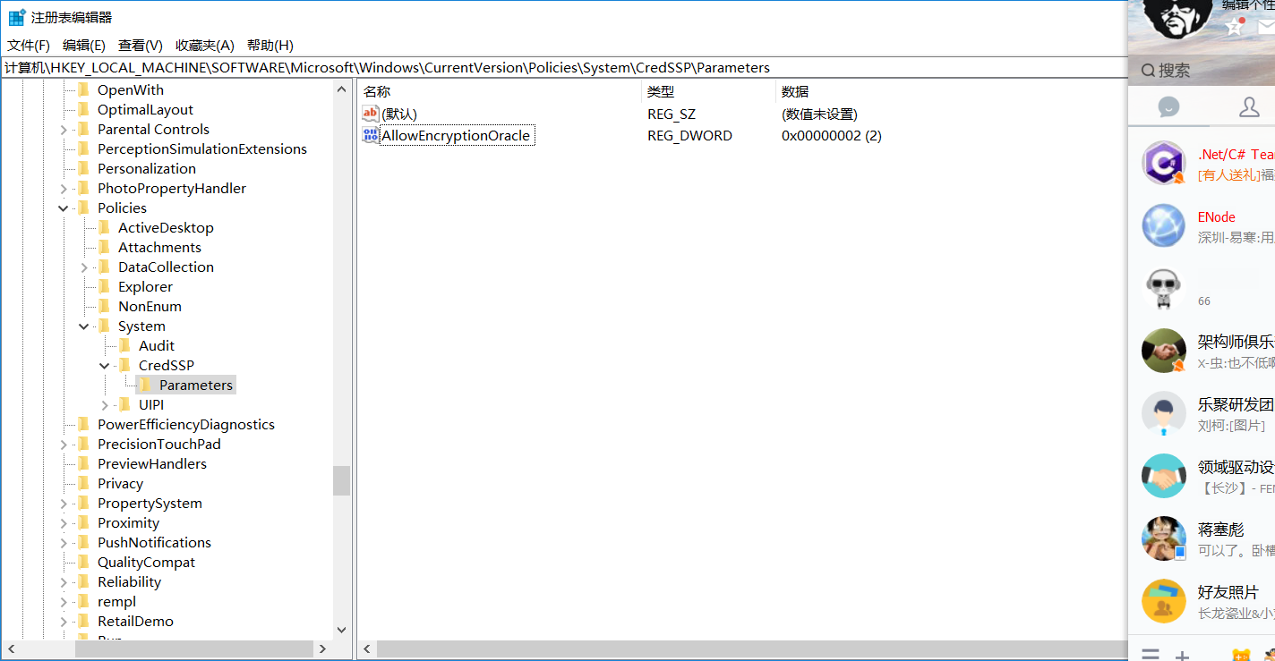 2.找文件夹 路径:HKLM(缩写)\Software\Microsoft\Windows\CurrentVersion\Policies\System\CredSSP\Parameters