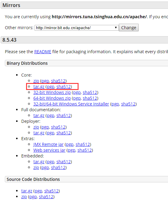 或者直接用以下链接下载 https://mirrors.tuna.tsinghua.edu.cn/apache/tomcat/tomcat-8/v8.5.43/bin/apache-tomcat-8.5.43.tar.gz