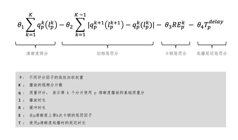 所以对主观体验的客观量化衡量这条路基本上很难走好。这里是一个业界广泛应用的QoE评估的标准公式,主要是在高清观看时长得到的基础体验分上,通过对切换清晰度、卡顿等负面体验的惩罚性扣分,来获得一个相对客观的QoE评估分数。整体看这个分数还是比较优雅的,但是实际使用效果其实比较差。第一个是它这个线性加权因子的权重,其实需要你自己调,比如你非常不希望用户发生卡顿,那么可以通过加大卡顿惩罚的θ因子来比较粗暴的训练、调整你的算法。