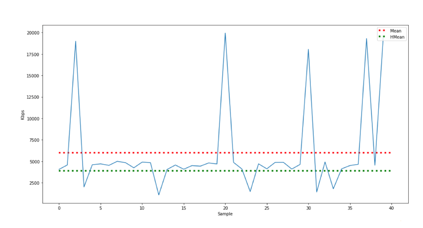 直播对带宽的处理有这样几个不同:第一是引入调和平均数,大幅度降低速度毛刺数据对整体评估值的干扰。如果单纯使用算术平均,比如把过去的2分钟的下载器速度统计做一下平均,偶发的抖动带来的影响是比较大的。从统计上说,这个调和平均数会让噪点数据对整体平均值拉大的幅度会极大的压缩它。