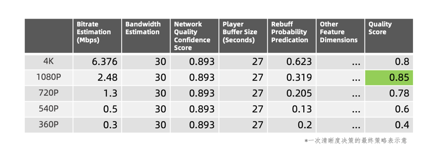 这个策略表就是一个对智能档决策机制的直观抽象,算法对每一种可能的组合输入计算出预期的QoE得分,然后选择最高的选项来执行。比如策略表里列了5种可选的清晰度,从4K到360p,有效带宽经过估算大概是30Mbps,然后0.893是对这个带宽以及当前网络质量的一个评估置信度,再结合其它一些输入比如buffer大小、二次卡顿概率等,最后得出一个决策表,选择一个QoE得分最高的就结束了一次决策流程。这个例子中1080P看上去清晰度比较容易接受,卡顿的概率比较低,选择这个可能是一个比较好的策略。