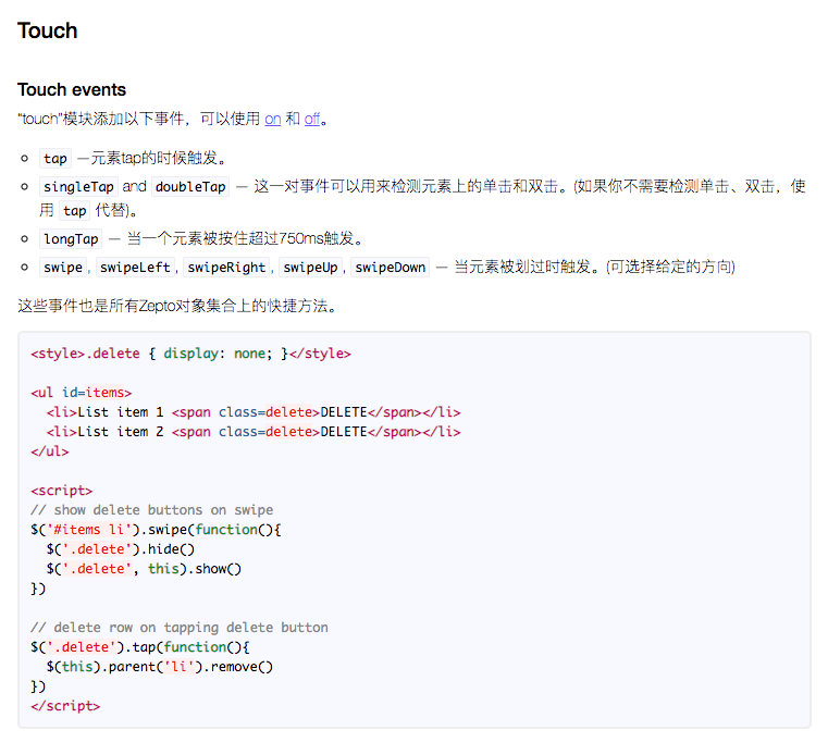 针对移动端程序,Zepto有一些基本的触摸事件可以用来做触摸屏交互(tap事件、swipe事件),Zepto是不支持IE浏览器的。