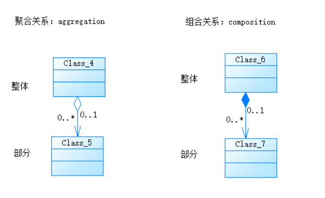 聚合:是两个类之间的一个二元关系,它表示一个类的对象实例以另一个类的对象实例作为其组成部分。
