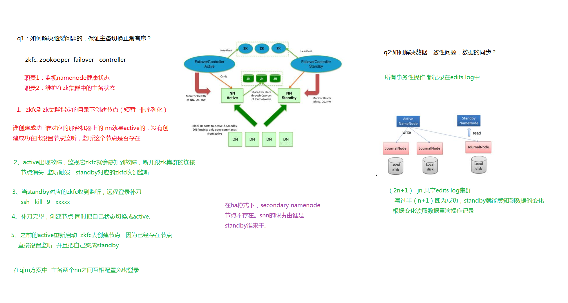 当发生故障时,Active 的 NN 挂掉后,Standby NN 会在它成为 Active NN 前,读取所有的 JN 里面的修改日志,这样就能高可靠的保证与挂掉的 NN 的目录镜像树一致,然后无缝的接替它的职责,维护来自客户端请求,从而达到一个高可用的目的。