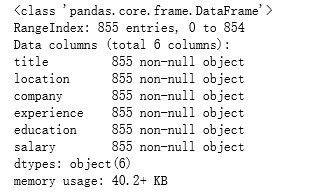 上面就是爬取到的信息总共是855条招聘消息,接下来就是用jumpter-notebook打开爬取到的csv文件用pandas,numpy,和mupltlib进行分析