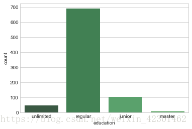 11 sns.countplot(x='education',data=lagou,palette='Greens_d')