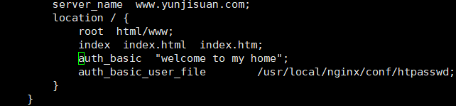 auth_basic_user_file /usr/local/nginx/conf/htpasswd;==>密码文件路径