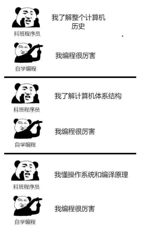 说实话,不得不说,有时候“科班程序员”虽然有些时候会让你感觉到他们有着一些些的优越感,但是技术也确实很给力,比如说在公司要使用一项新技术,他们能够二话不说的几天就能开始干活,而在这些内容上相比较,“培训出身”的程序员反而没有那么给力,而是得先摸清楚基础,毕竟大部分的科班生都是经过学校系统的学习,知识体系更加完整,所以能够更深入的解决问题,但是有一些碍于时间短的原因,没有成功的积累起来经验的时候,还是欠缺点火候的。