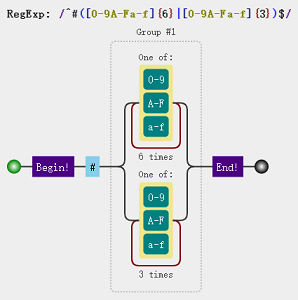 我们再来分析16进制颜色,老实说我还真不知道16进制颜色范围是多少,查了下,每个字母范围均为[0-9a-fA-F],但由于颜色值可以简写,比如 #ffffff 可以简写成 #fff,所以存在6位与3位的情况,正则可以这么写: