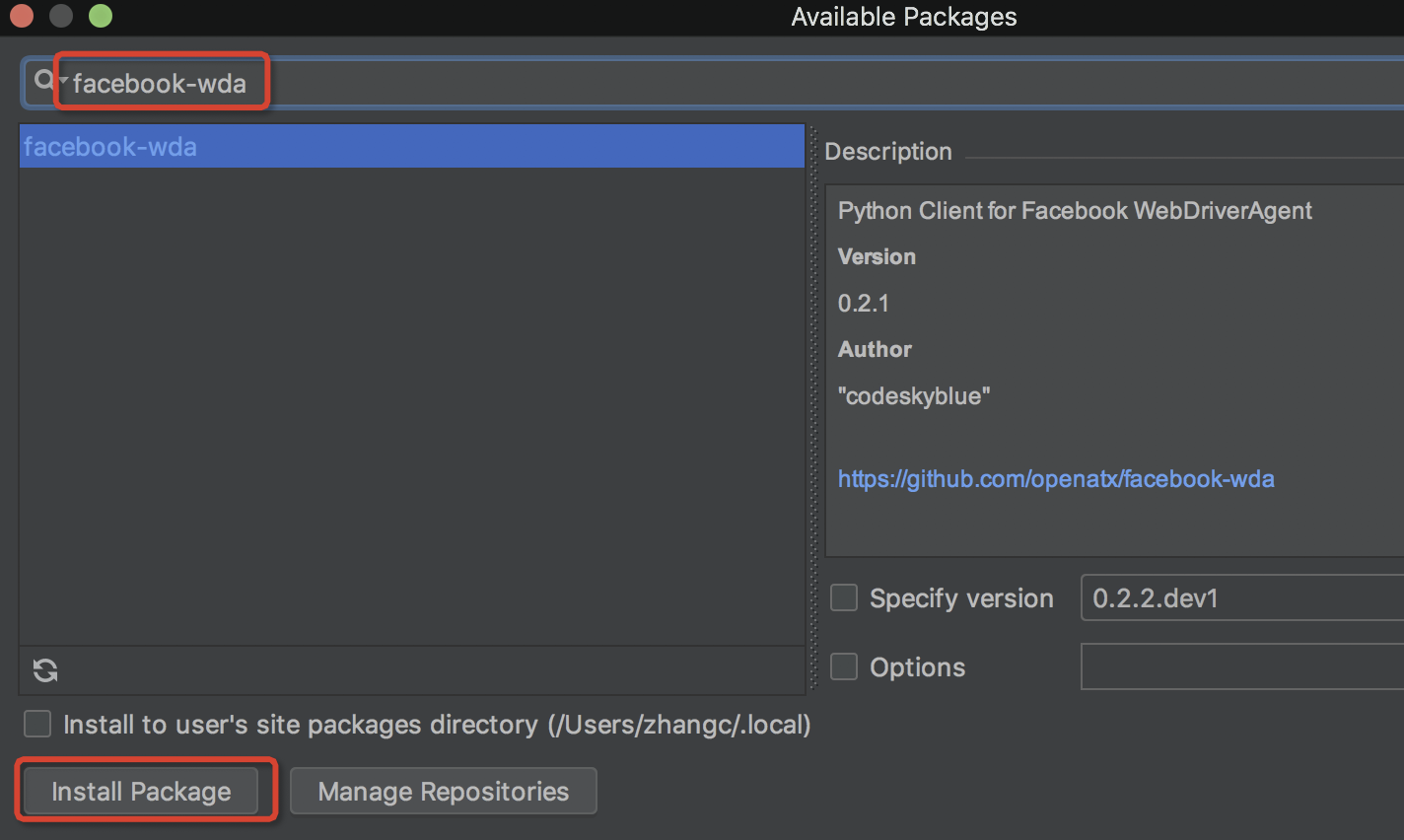 或者使用pycharm中,Preferences->Project->Project Interpreter->【+】(加号), 搜索:facebook-wda,并安装