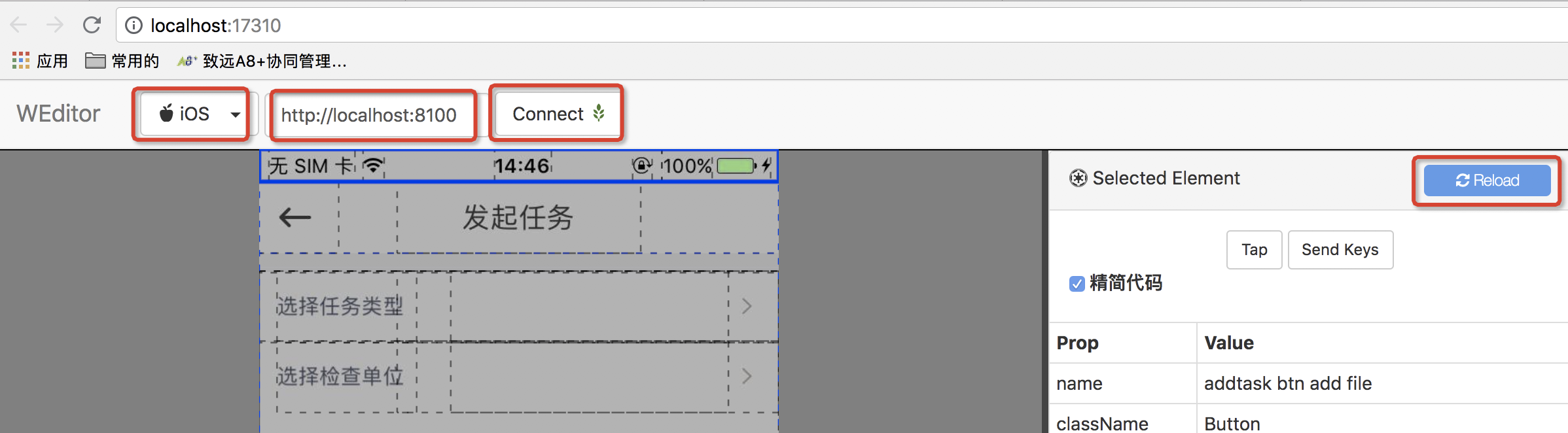 浏览器自动打开weditor,选择IOS,输入地址:http://localhost:8100,点击【Connect】连接,出现小绿叶🍀表示连接成功,再点击蓝色按钮【Reload】刷新如下: