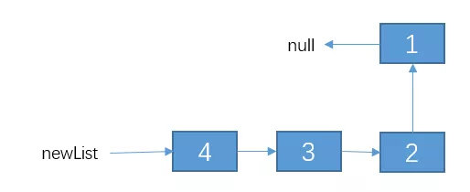 我们对子链表 2->3->4 进行递归,即 Node newList = reverse(head.next)。递归之后的结果如下: