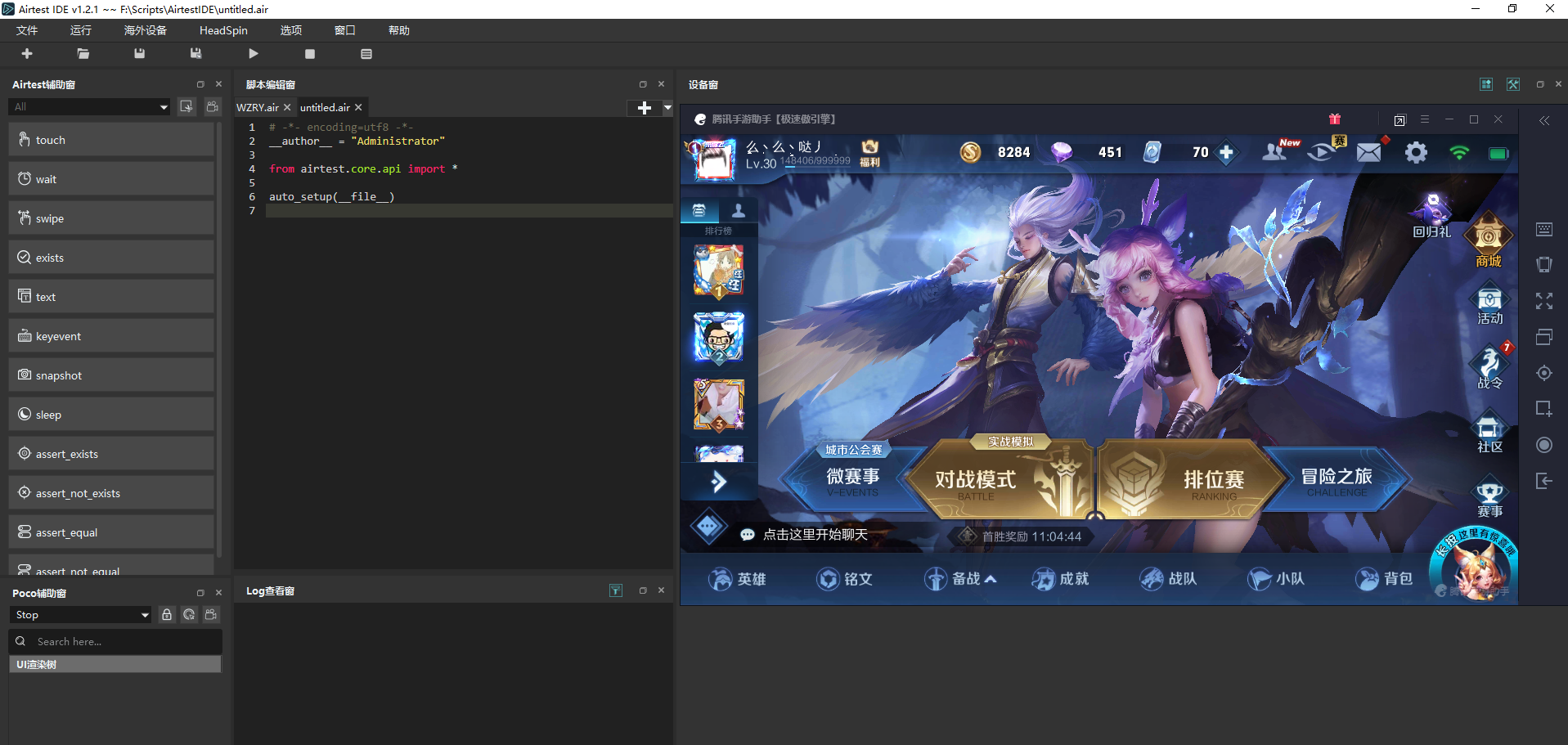 2)安装AirtestIDE,在设备窗中连接游戏Windows(详情参考笔者另外一篇博文: AirtestIDE详解(跨平台的UI自动化编辑器))