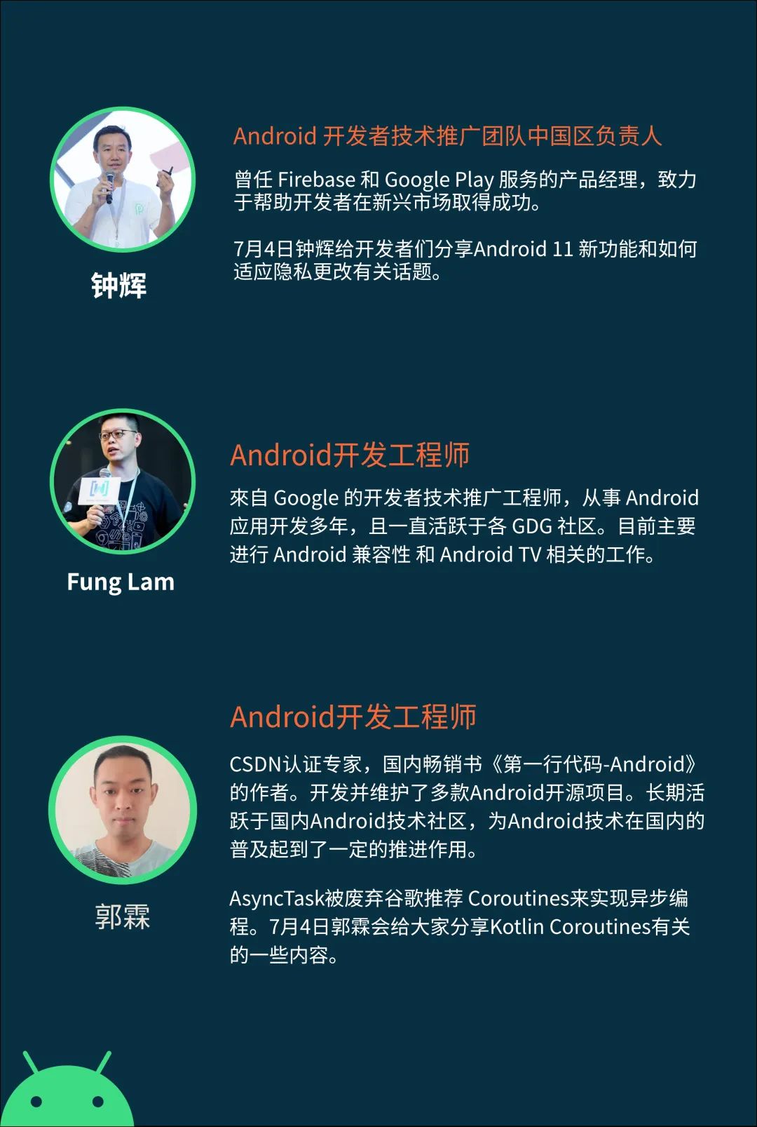 谷歌将在全球举办一系列线上活动。7月4日,中国的第一场 Android 11 Meetup 落在上海 ,由 GDG Shanghai 主办。我们会和大家一起探讨 Android 11 的新内容、应用兼容性,以及现代化 Android 开发的基本知识和最佳实践。让我们用技术人的热忱和独特的方式为时下的困境,注入一股技术正能量!
