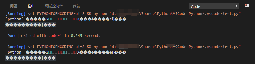 在环境变量里加上了Python安装路径并重新打开VS Code之后,再进行编译,输出变了,目测是输出的中文内容是乱码,之前的提示没有了。下面再解决输出乱码问题