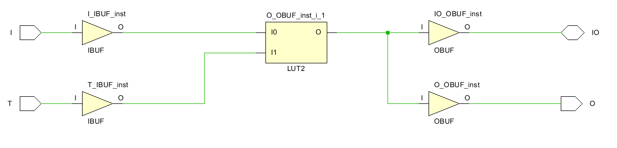 该代码使用Vivado编译后的原理图如下图所示。该实现方式也会调用IOBUF原语,但多消耗了一个LUT资源。