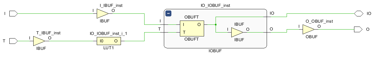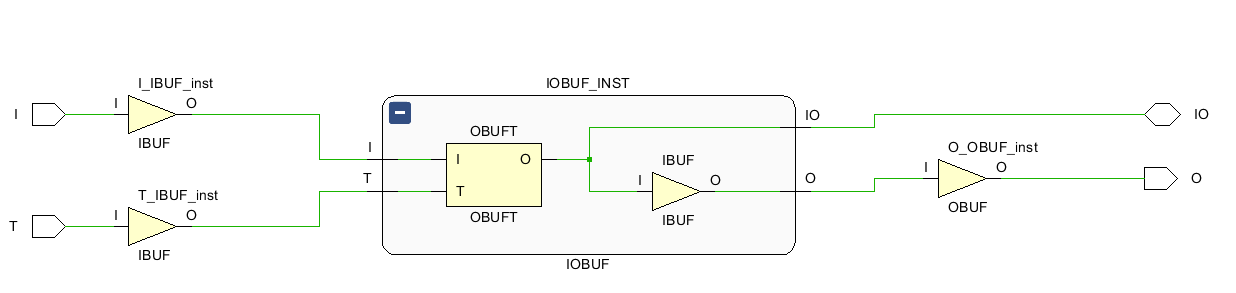 该代码通过原语IOBUF实现IO功能,使用Vivado编译后的原理图如下图所示。可以看到IOBUF内部由OBUFT和IBUF原语构成。