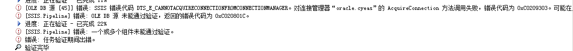 [OLE DB 源 [45]] 错误: SSIS 错误代码 DTS_E_CANNOTACQUIRECONNECTIONFROMCONNECTIONMANAGER。对连接管理器“oracle.cyeas”的 AcquireConnection 方法调用失败,错误代码为 0xC0209303。可能在此之前已经发出错误消息,提供了有关 AcquireConnection 方法调用失败原因的详细信息。