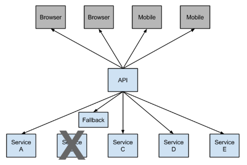 SpringCloud Netflix实现了断路器库的名字叫Hystrix. 在微服务架构下,通常会有多个层次的服务调用. 下面是微服架构下, 浏览器端通过API访问后台微服务的一个示意图: