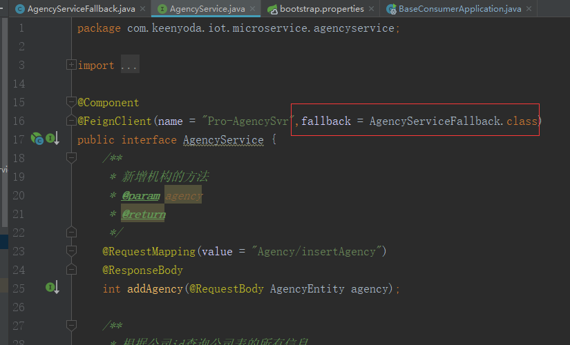 2). 用@FeignClient注解添加fallback类, 该类必须实现@FeignClient修饰的接口。