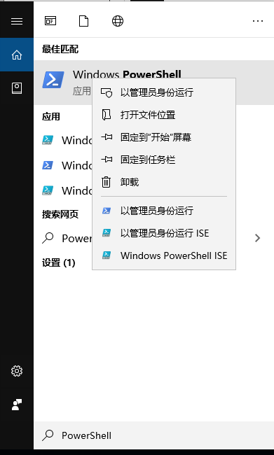 第二步搜索到PowerShell之后,鼠标右键以管理员身份运行,如下图所示: