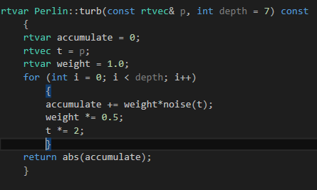 rtvar Perlin::turb(const rtvec& p, int depth = 7) const