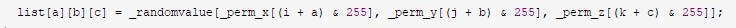 return _randomvalue[_perm_x[i] ^ _perm_y[i] ^ _perm_z[i]];