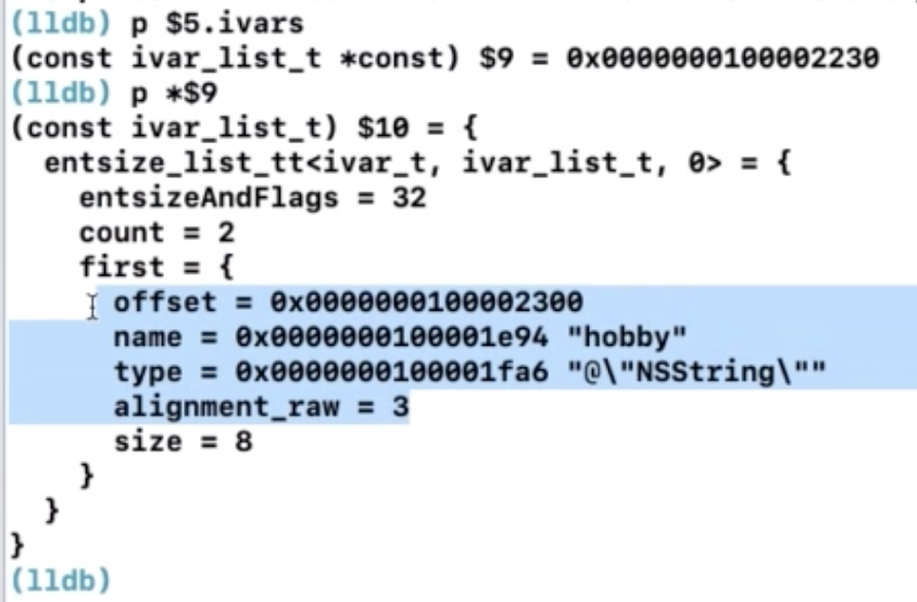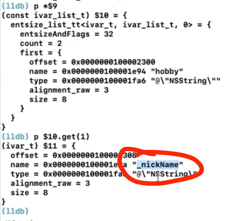看到这里,如果你细心的话,你会发现ivars里面的count是2,可是我当初声明的时候明明只声明了一个成员变量hobby啊,这是为啥?原因就在于我需要给属性nickName声明一个内部的成员变量,也就是_nickName: