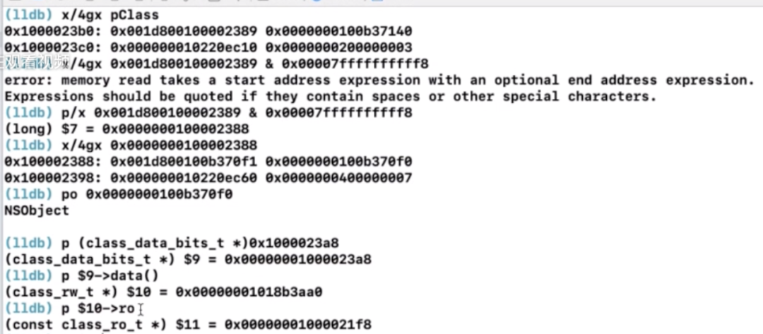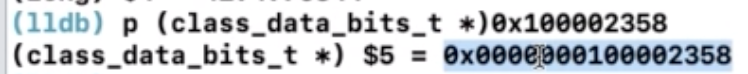元类的首地址是0x100002388,平移32字节之后是0x1000023a8,进而得到bits,然后强转为class_data_bits_t,然后获取到rw,进而得到ro。