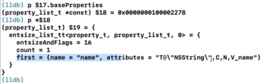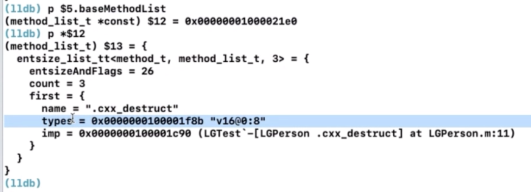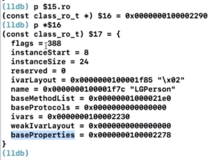 struct class_ro_t {uint32_t flags;uint32_t instanceStart;uint32_t instanceSize;uint32_t reserved;const uint8_t * ivarLayout;const char * name;method_list_t * baseMethodList;protocol_list_t * baseProtocols;const ivar_list_t * ivars;const uint8_t * weakIvarLayout;property_list_t *baseProperties;method_list_t *baseMethods() const {return baseMethodList;}};