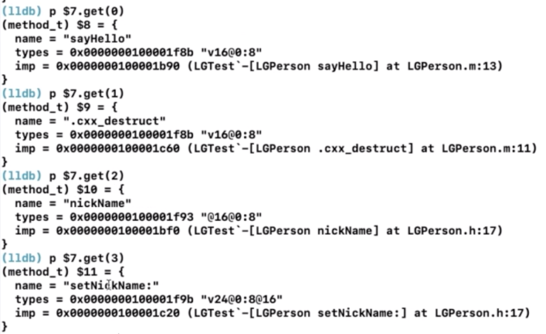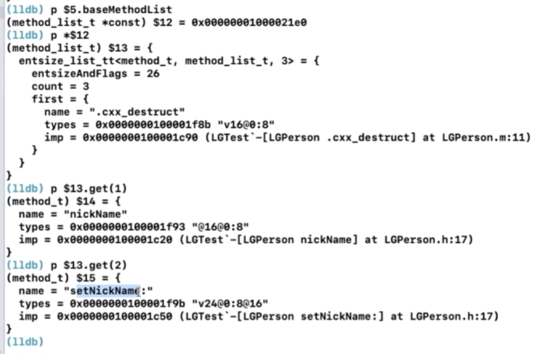 我们发现,此时baseMethodList中有四个方法,分别是:sayHello、.cxx_destruct、nickName、setNickName:。