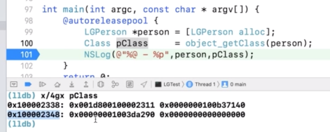 x/4gx pClass 是获得类的内存结构,其第一段内存存储的是isa指针。