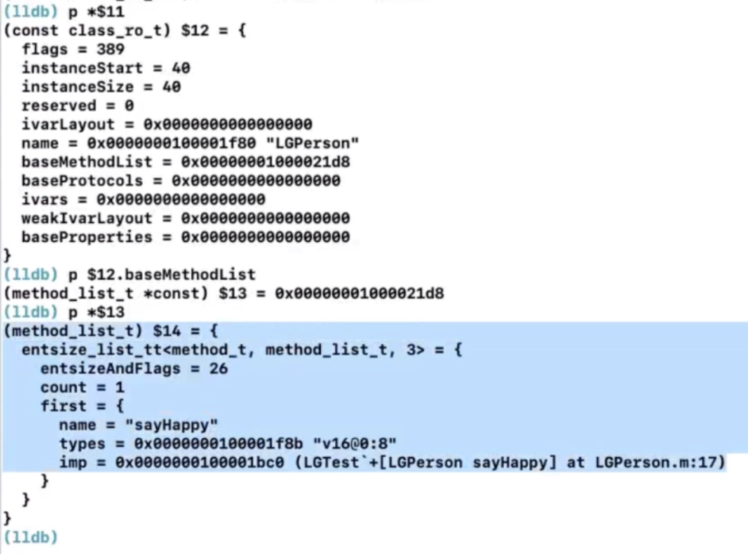 此时,想必很多人都已经知道了,sayHappy方法是一个类方法,它存储在元类的baseMethodList里面,接下来就验证一下。